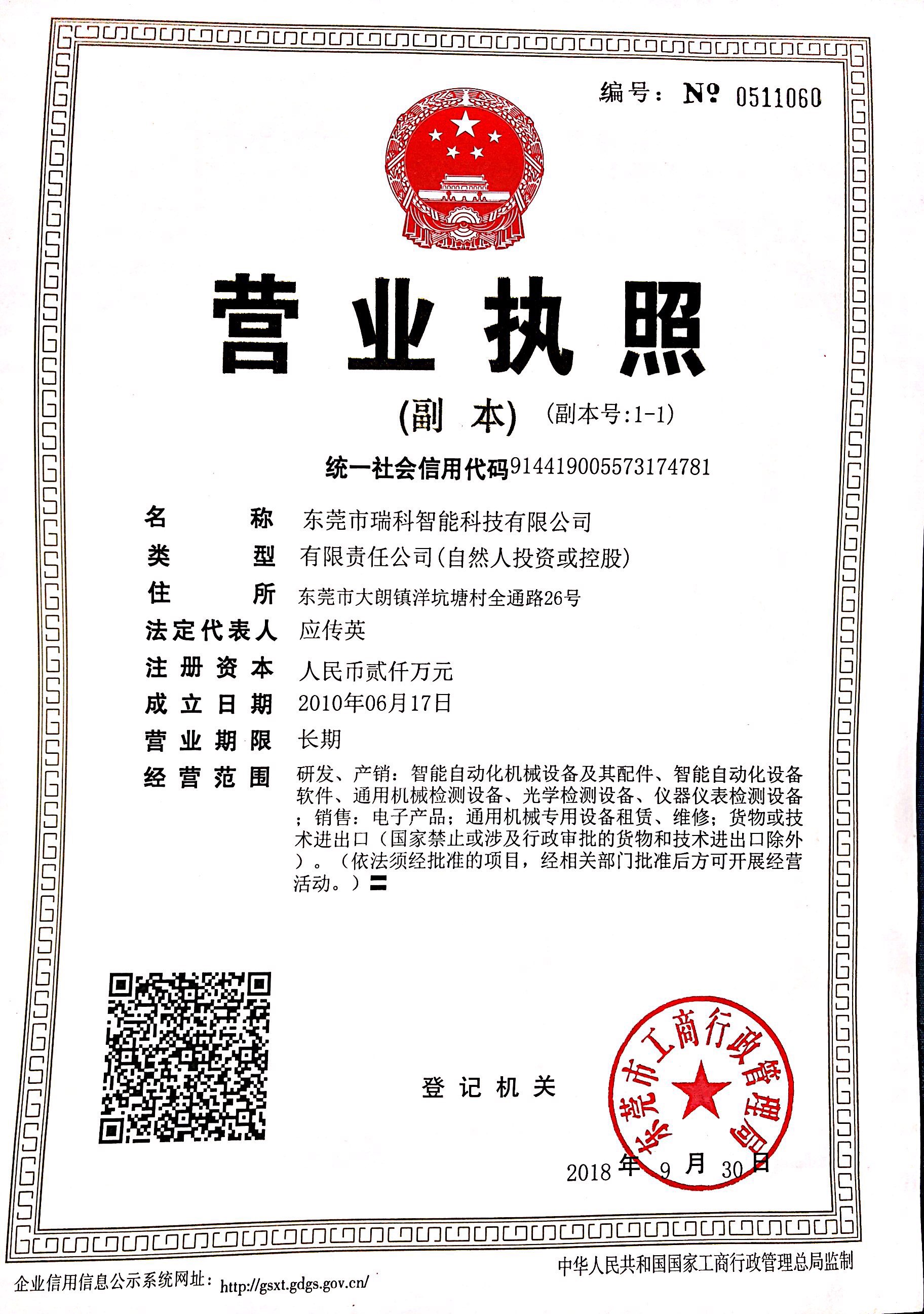 2018年9月30號,東莞市瑞科智能科技有限公司獲得東莞市工商行政管理局注冊成功的新營業(yè)執(zhí)照,東莞市瑞科自動化設備有限公司正式更名為東莞市瑞科智能科技有限公司,標志著瑞科又發(fā)展到一個新的高度。